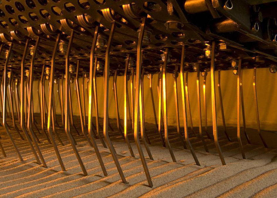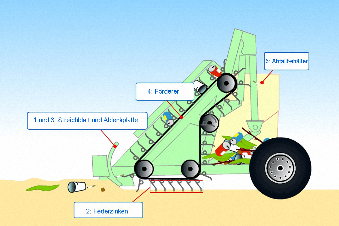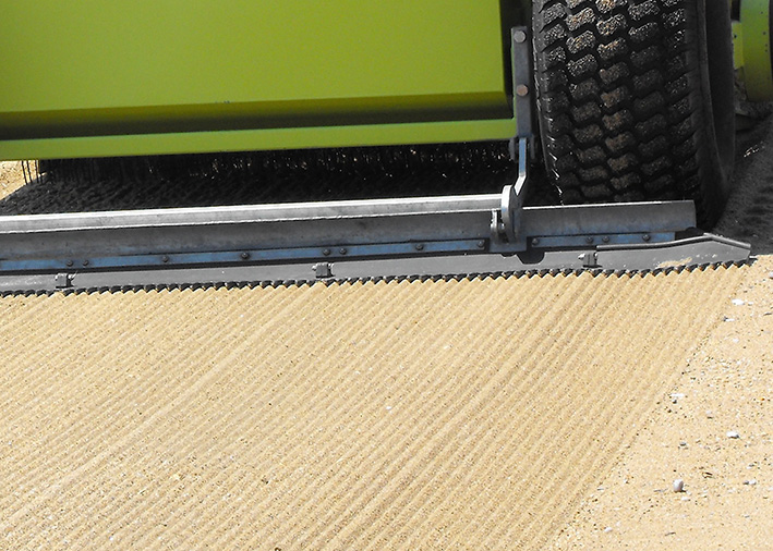 Hunderte von Edelstahlzinken, die in versetzten Reihen angeordnet sind, kehren den Sand in jeder Sekunde und entfernen unerwünschten Abfall. Selbst die kleinsten Gegenstände wie Glasstücke, Zigarettenstummel, Ring-Pull-Verschlüsse und Kronkorken werden von der Maschine erfasst und im Abfallbehälter deponiert.