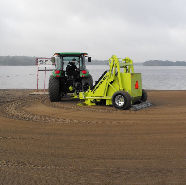 Die Barber SURF RAKE® Maschine ist ein spezielles mechanisches Rechsystem, das von einer Person bedient wird, die auf dem Sitz eines die Maschine ziehenden Traktors sitzt. Dieses Modell sorgt für eine sichere, schnelle und effiziente Strandreinigung. Und so läuft der Prozess ob: l . Das Streichblatt planiert ungleiche Bereiche im Sand. 2. Ein 3/8-Zoll-Gitter mit Edelstahl-Federzinken harkt Abfälle aus dem Sand zu einer 3 einstellbaren Ablenkplatte hin. Auf diese Weise wird Müll auf 4. dem Förderband zum 5. hydraulisch angehobenen Abfallbehälter abgelegt. Das Ergebnis: ein sauberer, sicherer und gepflegt aussehender Strand.